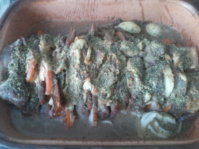 A szalonnát,paradicsomot, kolbászt vöröshagymát, bele rakom a bevagdalt tarjába, közé dugdosom a fokhagyma gerezdeket és megkenem házi ételízesítővel, és mustárral és hagyom állni egy órácskát. Ha marad ki a töltelékből azt mellé teszem.